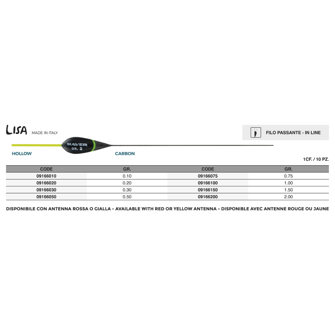 Galleggiante a goccia rovesciata perfetto per pescate difficili quando vogliamo insidiare pesci sospettosi non rinunciando alla visibilità, l’antenna cava riempita con la fibra fino a ¾ della lunghezza e il foro passante laterale, lo rendono affidabile ed allo stesso tempo estremamente facile da tarare a bolla come si necessita in pescate invernali. La deriva in carbonio lo rende molto dolce sull’entrata in pesca e fa sì che segua perfettamente la calata dell’esca.
