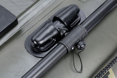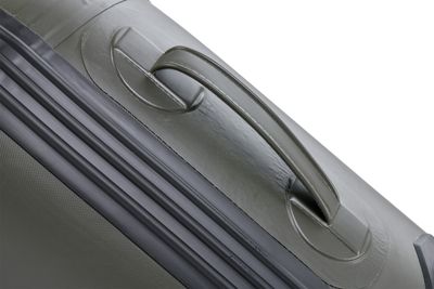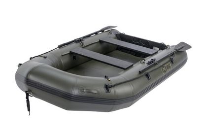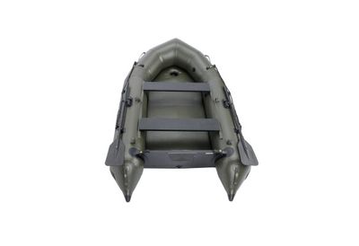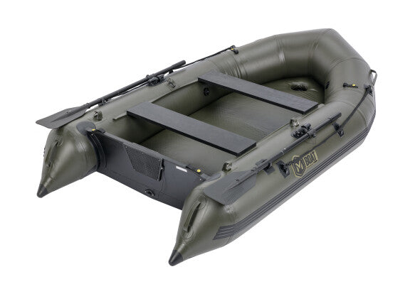 The second generation of M-BOAT AWB inflatable boats retains all the advantages and unique features of this model, adding a number of improvements. The larger-than-standard width and the specific shape of the boat ensure an extremely large interior space, which is always significantly larger than that of standard boats of the same length on the market. This is further enhanced by the specific design of the rear part of the pontoons, which allows the transom to be positioned as close as possible to the end of the pontoons, while maintaining their function in maintaining the direction of travel. The significantly raised bow, together with the specially shaped front section, a robust inflatable keel running the entire length of the floor and the specially designed transom, provide excellent hydrodynamic properties and directional stability. In practice, this means higher speed, easier maneuverability and less energy consumption when propel the boat. The reinforced material of the pontoons increases puncture resistance. The inflatable floor with a double layer of tread is almost indestructible and its green color harmonizes well with the color of the boat and with the black oars and other accessories. Each boat is equipped with Velcro straps in the front section and on the transom. There is also a heavy duty accessory strap in the center section.
