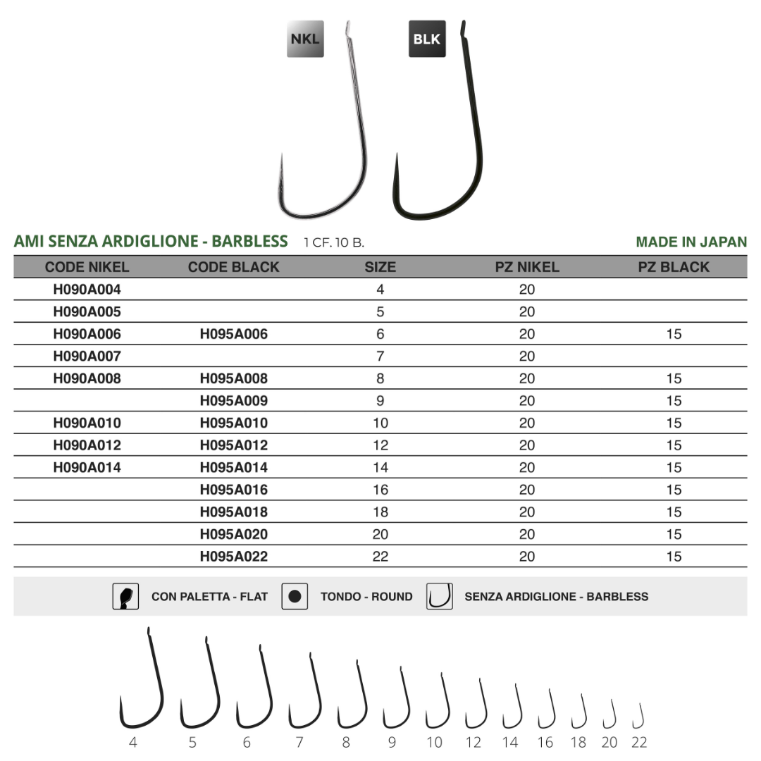 Amo senza ardiglione a filo rotondo con punta inclinata verso l’interno di 30° gradi; Nella versione nichelata nelle misure dall’8 al 12 risulta ideale per la pesca NO KILL in gara della trota lago; sia nella versione Nichelata che in quella black nelle misure dal 14 al 22 è un amo ideale per la pesca nelle acque commerciali a carassi e carpe di medio piccola dimensione, perfetto da abbinare con l’innesco di bigattino ed orsetto data la sua leggerezza indispensabile per rendere l’innesco più naturale possibile.