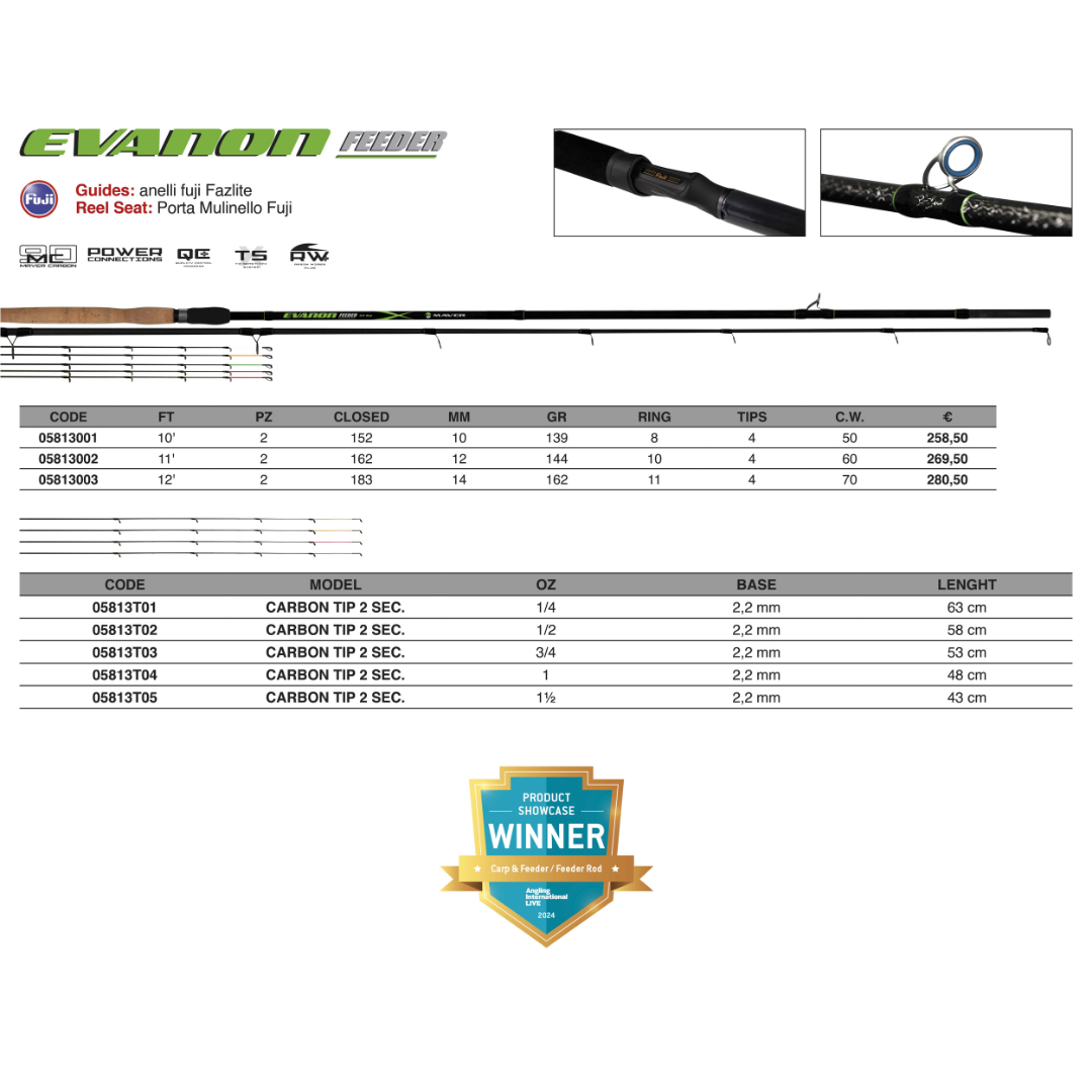 Serie composta da ben otto canne che si differenziano in numero di sezioni, lunghezze e casting per assecondare al meglio l’esigenza di tutti i pescatori. La serie Evanon in 2 sezioni nasce per la pesca in acque commerciali, cime da 2.2mm in cinque diverse potenze, dalla ¼ oz cima con una morbidezza mai vista prima alla 1 ½ oz per le pescate più impegnative. La serie in 2 sezioni è composta da 3 canne, la 10ft misura classica per la pesca commerciale, la 11ft per quando si ha bisogno di una grande precisione anche a media distanza e la 12ft in due sezioni perfetto per le pesche a lunga distanza a tutti i ciprinidi, canna con un azione molto soft che ci permette di combattere qualunque tipo di preda senza alcuno sforzo. Le 3 sezioni invece hanno uno spirito molto più rivolto al canale.