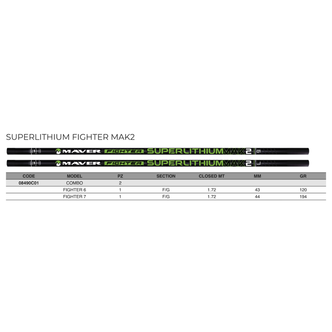 Il Superlithium Fighter MAK2 è composto da due elementi el.F ed el.G che sono elementi realizzati con particolari laminazioni rinforzate che li rendono veramente robusti ed ideali per la pesca a media distanza, sono studiati per essere compatibili con tutte le canne in collezione della serie KYON RS, si possono quindi tranquillamente utilizzare anche in abbinamento con tutti i kit in collezione e con le miniprolunghe X2.